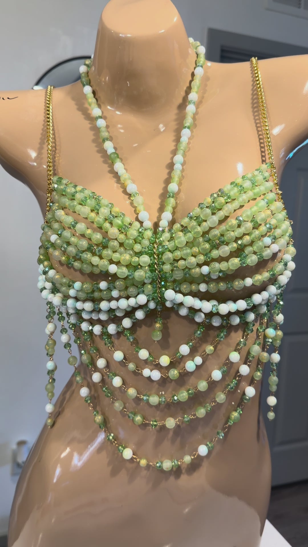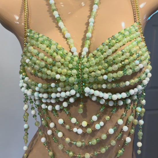 ONE SIZE FITS ALL. This stunning handcrafted beaded top is a true statement piece designed to turn heads. Featuring layers of lustrous green, white, and pale yellow beads, it creates a luxe, sculpted silhouette that shimmers with every movement. Gold chain straps add a touch of glam while providing structure and support. Perfect for festival looks, editorial shoots, or bold evening wear, this piece effortlessly blends artful craftsmanship with high-fashion allure. *Can be paired with Bermuda shorts under "Bottoms." (Please consider wearing nipple coverings or tape under bralette).